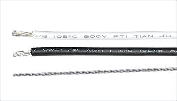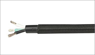 The wires are encased in a black plastic sleeve with writing on part of it, within a braided fabric sleeve. The ground wire is separate.