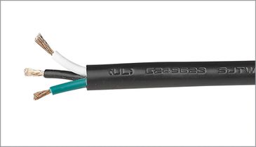 All wires are encased in black plastic within a braided black sleeve. The ground wire is green or blue. The neutral is white. The hot is black.