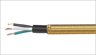 All wires are encased in black plastic within a braided gold sleeve. The ground wire is green or blue. The neutral is white. The hot is black.